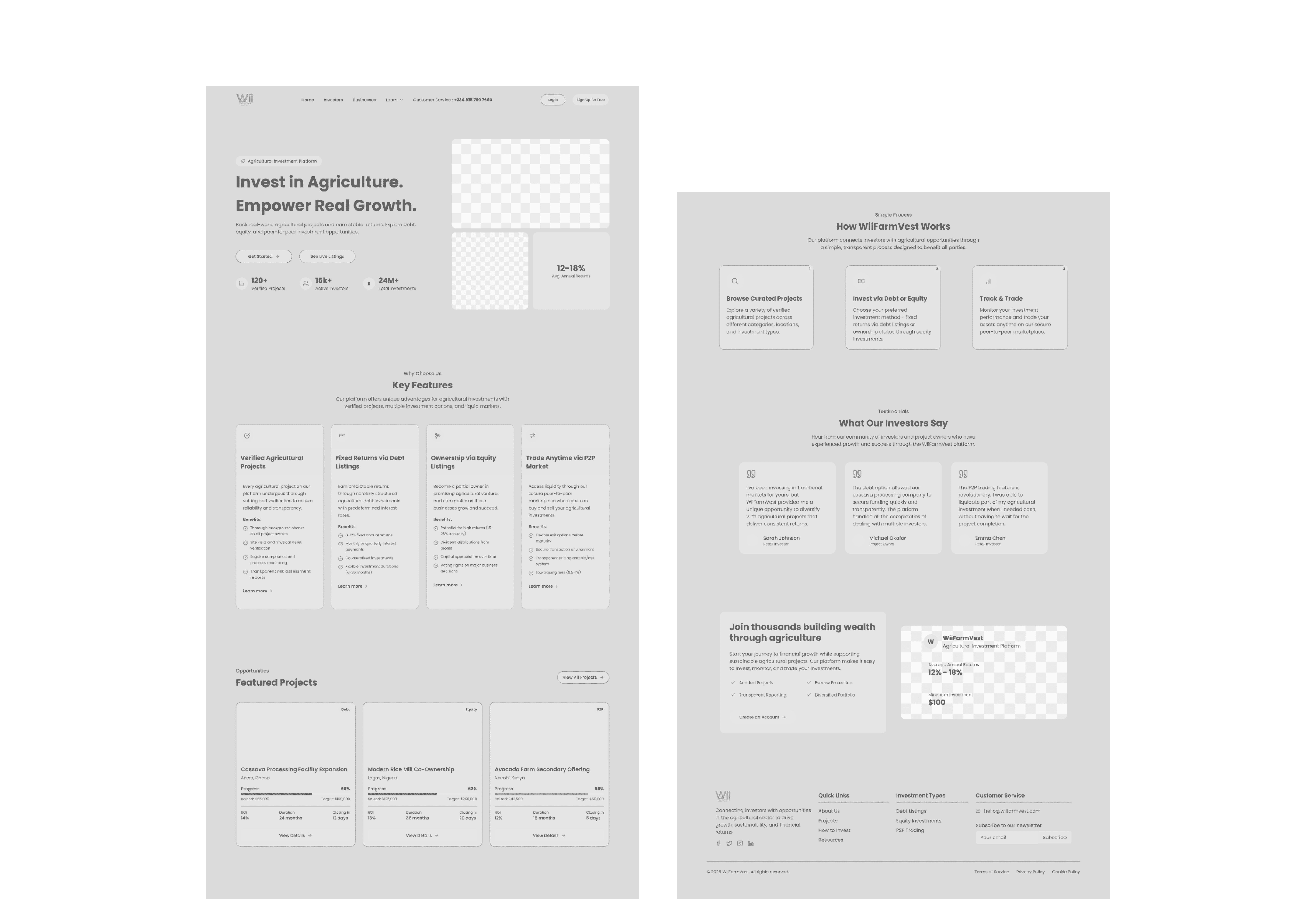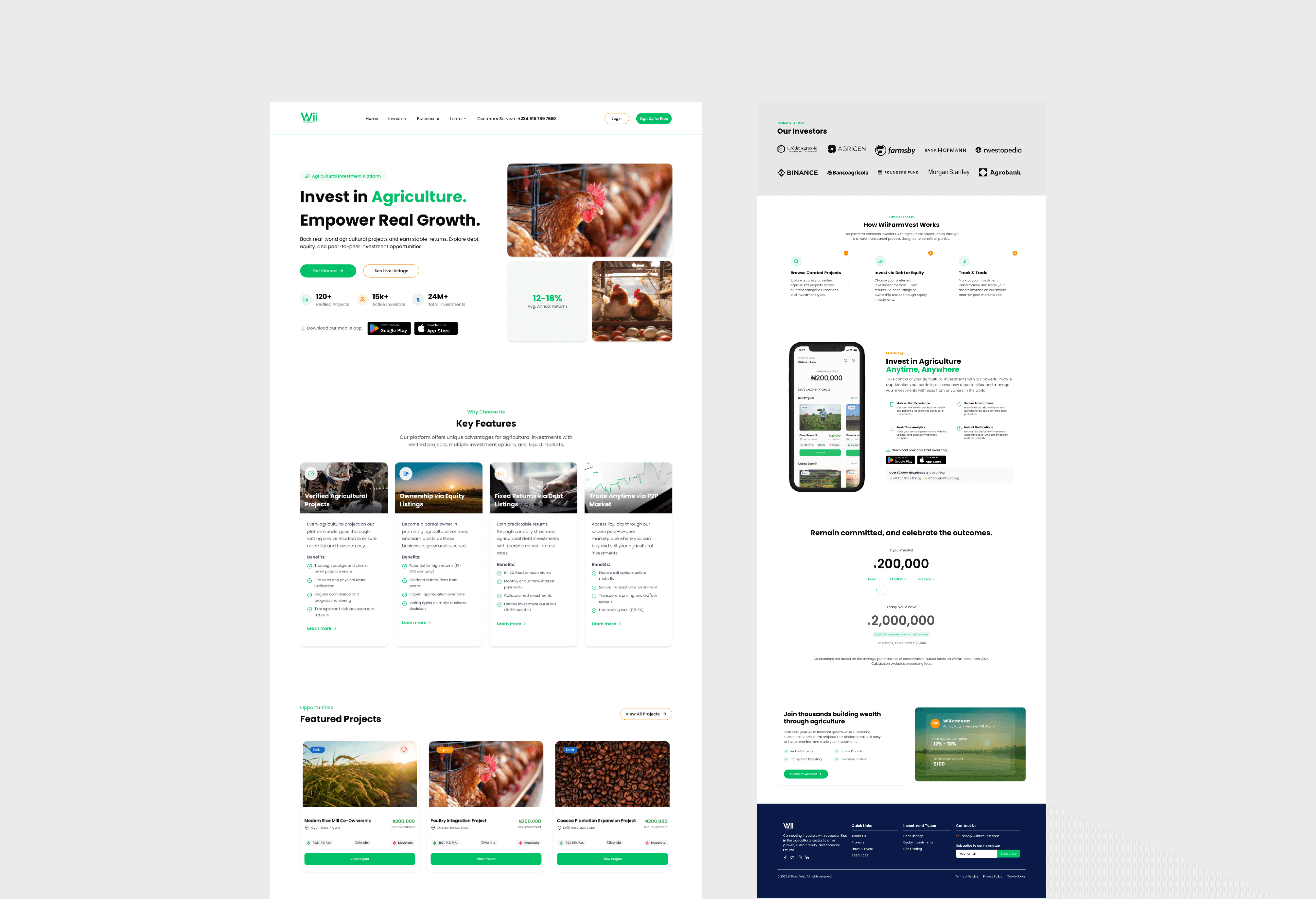 📝 WiiFarmVest Landing Page Design Overview 🔍 Research & Competitive Analysis The design journey began with an in-depth research phase aimed at understanding the agricultural investment space. I conducted a competitive analysis of similar platforms, carefully examining their positioning, feature offerings, visual identity, and user engagement patterns. This process allowed me to identify key opportunities for differentiation, especially in areas like user clarity, visual trust signals, and accessibility of investment information. These insights guided the foundational direction of the landing page, ensuring that the design was not only aesthetically appealing but also strategically aligned with market expectations and user behaviors. 🎨 Design System Development With the design direction defined, I proceeded to build a robust design system. This system included: Color Palette: Inspired by nature and agriculture—blending earthy greens and modern neutrals to evoke trust and sustainability. Typography: Clean and readable typefaces selected to ensure hierarchy and legibility across all screen sizes. Components & Variants: I created reusable UI components (buttons, cards, modals, navigation bars) with multiple variants to maintain consistency throughout the interface. This design system not only streamlined the UI development process but also laid the groundwork for future scalability across other pages and platforms. 🧱 Low-Fidelity Wireframing & Client Demo To bring structure to the landing page, I created a low-fidelity wireframe prototype that mapped out the key user flows, content hierarchy, and visual structure. The wireframe was demoed to the client to gather early feedback, validate expectations, and ensure that the visual and functional layout aligned with the business goals. ✨ High-Fidelity Design & Responsiveness After securing client approval, I transformed the wireframe into a high-fidelity prototype—applying the design system, incorporating brand visuals, and refining interaction details. Every section was optimized for mobile responsiveness, ensuring seamless user experience across devices. The final prototype reflected a clean, modern, and engaging design that was both functional and visually compelling.